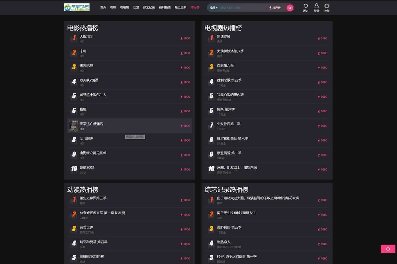 2024-02-02 蜻蜓導航 已瀏覽1281次全新仿短視影視模版源碼 PC+H5自適應 黑白雙皮膚 ,蘋果cms系統